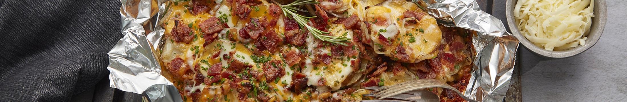 - Sprinkle all remaining ingredients evenly over potato/onion mixture. Cover with a second sheet of greased foil and crimp around edges to seal.
