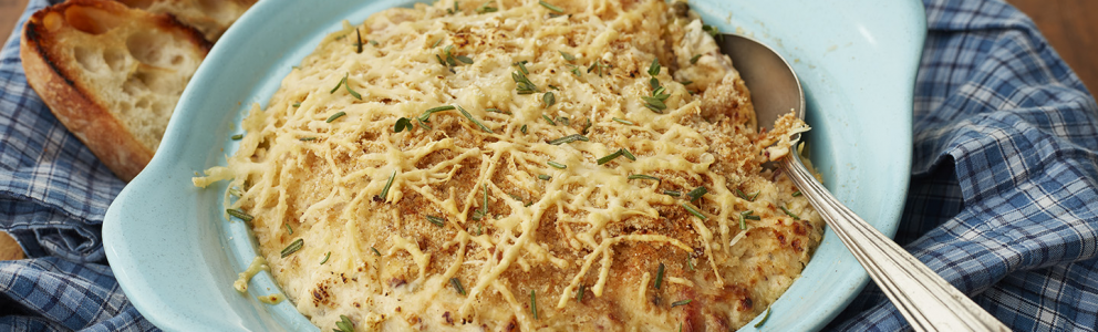 - Place dip in oven safe bowl and top with breadcrumbs and Parmesan cheese.