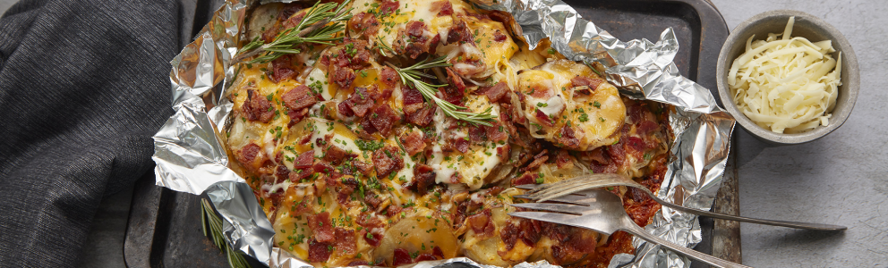 - Sprinkle all remaining ingredients evenly over potato/onion mixture. Cover with a second sheet of greased foil and crimp around edges to seal.